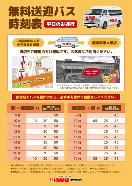 ・車内は禁煙です。 ・乗車マナーを守り明るい車内づくりにご協力お願いいたします。 ・交通事情等により遅れる場合がございます。 |