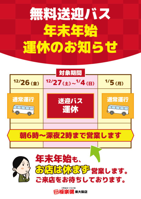 | ●石けん、シャンプー等の備え付けはございません。ご持参いただくか販売品をお求めください。 ●暴力団、並びにその関係者とみなされる方、刺青、タトゥー(シール含む)、泥酔の方はご入館を固くお断りします。 ●館内への飲食物のお持ち込みはご遠慮ください。 |