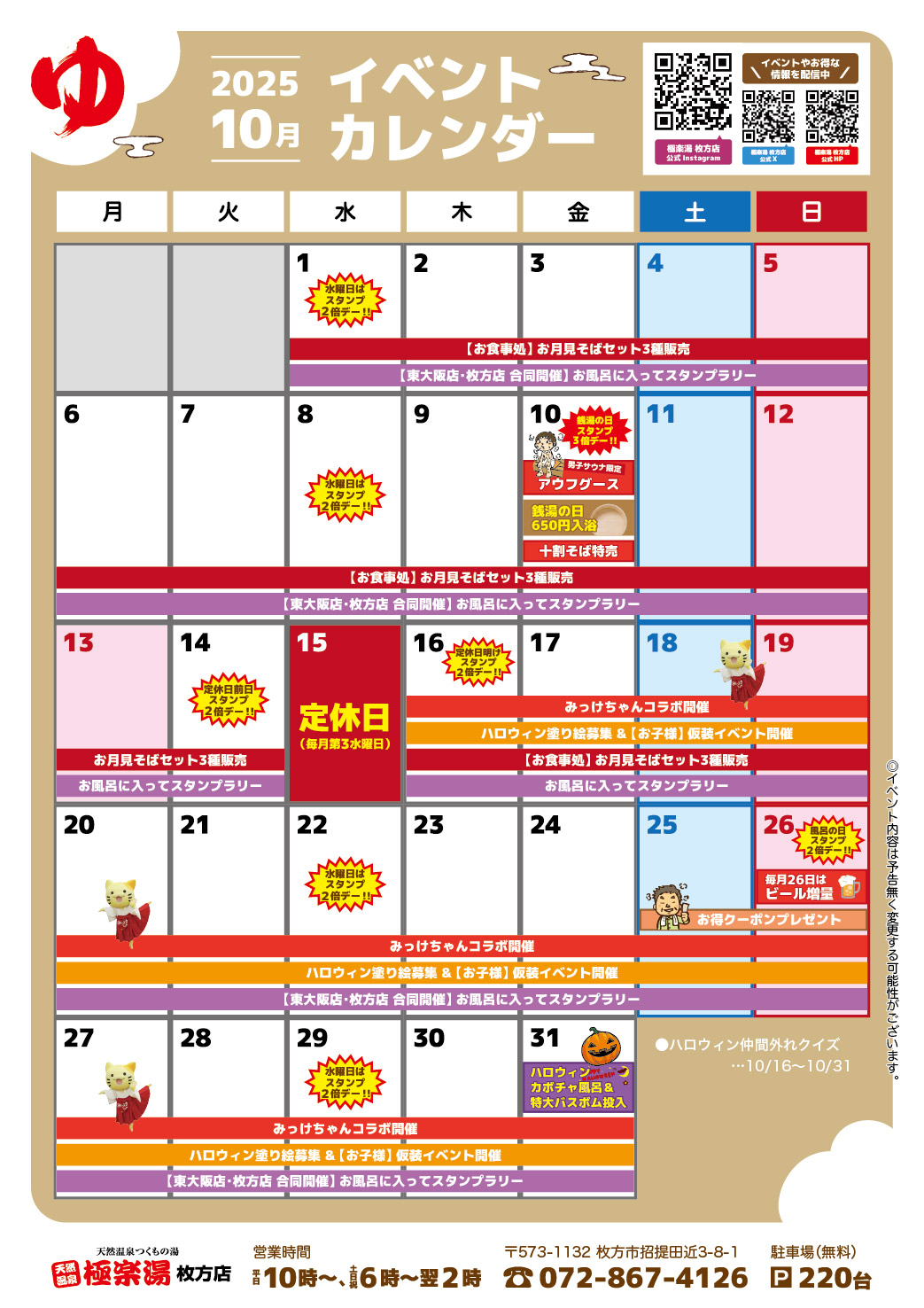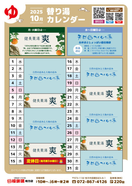 ●石けん、シャンプー等の備え付けはございません。ご持参いただくか販売品をお求めください。 ●暴力団、並びにその関係者とみなされる方、刺青、タトゥー(シール含む)、泥酔の方はご入館を固くお断りします。 ●館内への飲食物のお持ち込みはご遠慮ください。 |