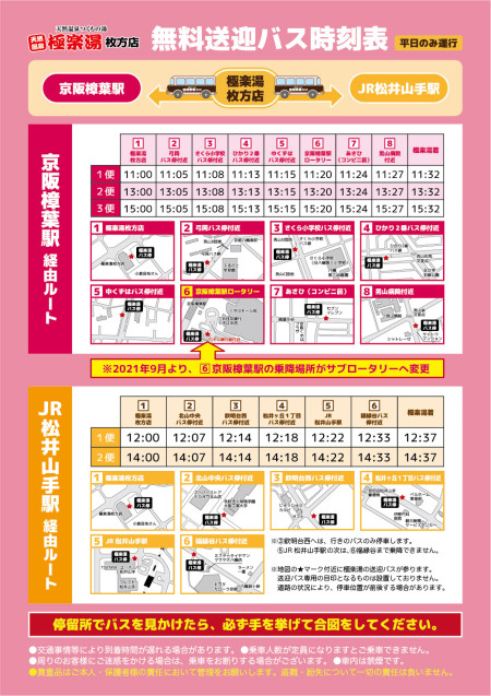 ・車内は禁煙です。 ・乗車マナーを守り明るい車内づくりにご協力お願いいたします。 ・交通事情等により遅れる場合がございます。 |