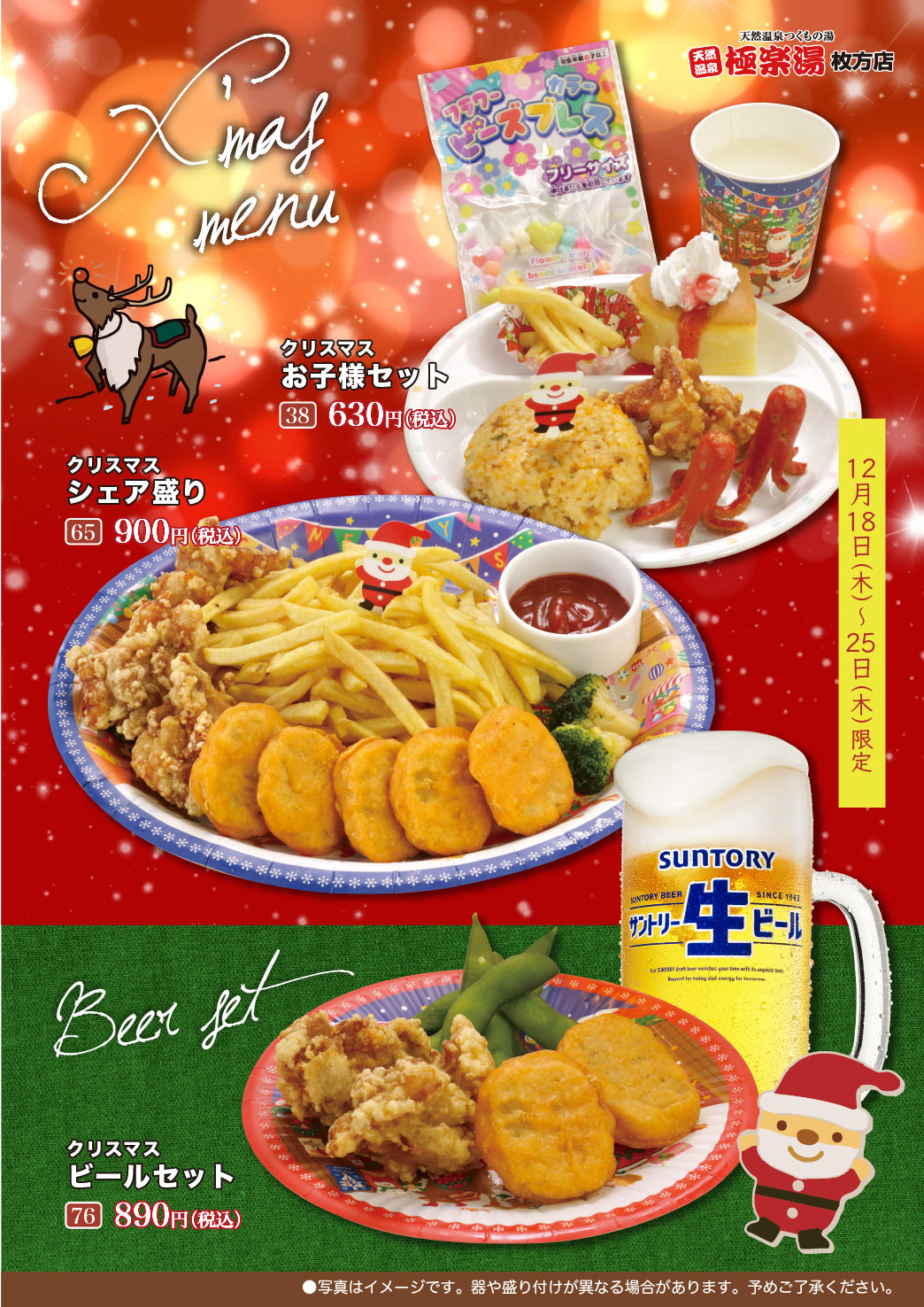 宴会をご利用の方で入浴を希望されるお客様には +700円でお風呂セット付き入浴もご用意しております。 (貸タオルセット・シャンプー・リンス・ミニ石けん付き) |