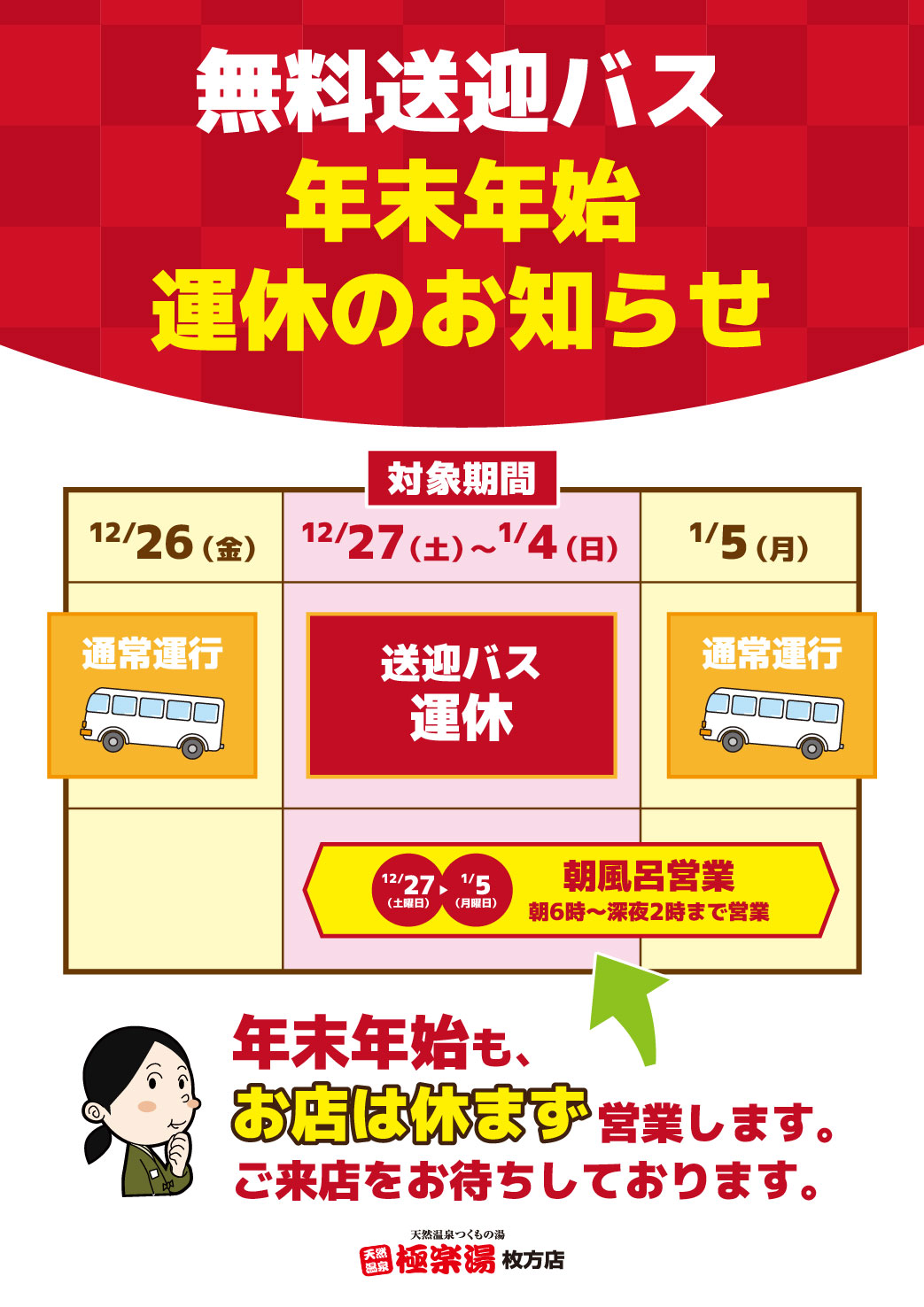 | 営業時間 | 7・8・9月は朝風呂! 平日も土日祝も 朝6時~翌2時まで営業します! (受付終了1:30) |